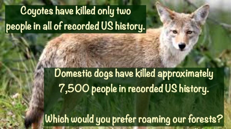 Domestic dogs are man’s best friend, but an abused, neglected, feral, or stray dog is a much bigger threat to humans and livestock than a coyote could ever be. If you want to protect people, pets, and livestock— let the shy, nervous, relatively small coyote live in peace or we would have a much larger problem. Keep your pets and livestock contained and install motion-activated flood lights if you’re concerned.