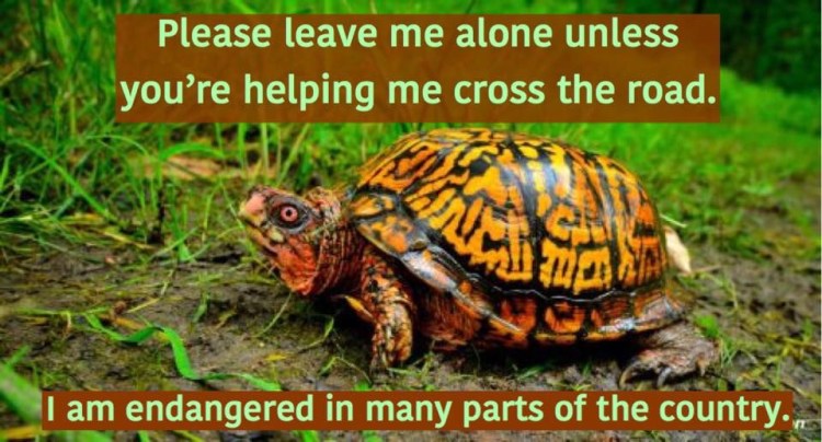 An Eastern box turtle should NEVER be relocated, or brought home as a pet. These precious animals are considered to be threatened and endangered, with the pet trade and personal “kidnapping” being among of their biggest risks. When handled, they experience extreme stress but don’t have the strength or speed to get away. Keeping a wild box turtle as a pet is deadly for the turtle due to their strict nutritional needs, and it is usually illegal, as well. If you see a wild turtle crossing the road, simply help it along in the way it was going. If it’s not in the road, please leave where it is and admire your turtle neighbor from afar.
