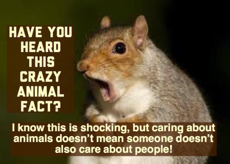 Most people are capable of caring about more than one thing. Although I’m sure there’s some nutcase, among the seven billion people on Earth, who actually values the lives of animals over humans, but I have yet to meet them. Most animal lovers also care very deeply about issues affecting human beings. Saving an orphaned fox doesn’t mean that I do not also care about orphaned children.