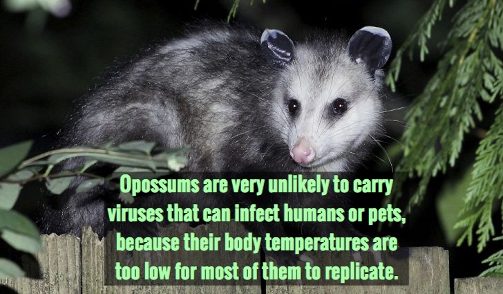 Opossums look a little bit like huge rats, so they’ve been mistakenly associated with disease. But, with very few exceptions, opossums can’t and don’t carry the same viruses that infect humans and pets. An opossum’s normal body temperature is typically around 93-94 degrees, and sometimes as low as 89-90 degrees.