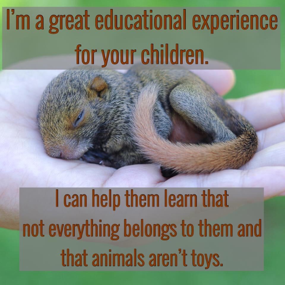 One of the most common reasons people give for raising wild animals without training is, “I thought it would be a good educational opportunity for my kids.” Seeing an animal die a very slow, painful death from improper care is certainly not what these parents had in mind.