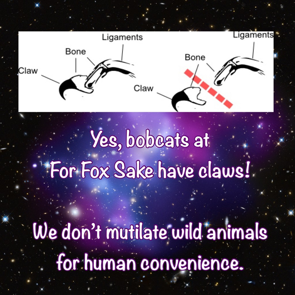 Bobcats need their claws for proper balance because they are digitigtade, meaning they walk on their toes. Declawing amputates the toe past the last knuckle, leaving bobcats (and any other declawed animals) susceptible to arthritis and chronic pain. A declawed bobcat is also much more dangerous than a bobcat with its natural claws, because they are much more likely to bite in self defense. Some organizations and pet owners solve this problem by also removing teeth, but removing teeth unnecessarily is also extremely cruel.