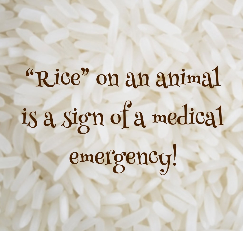 If you find a critter with rice-like grains on its body, please immediately help if it’s safe for you to do so. Put the animal somewhere dark, warm, and quiet and contact a rehabilitator for further assistance.