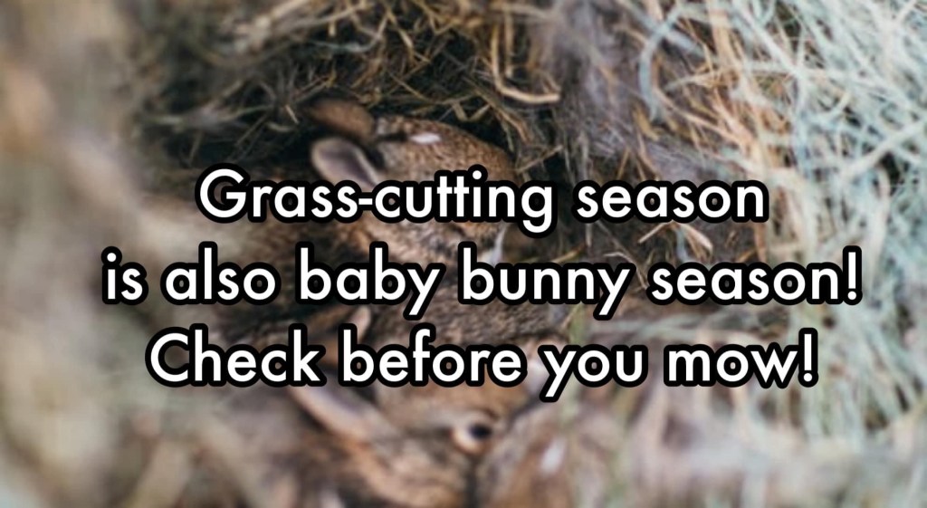 If you’re here in the South, you’re probably getting ready to break out the lawn mower for the first time this year. Please be sure not to harm any baby bunnies when you mow!