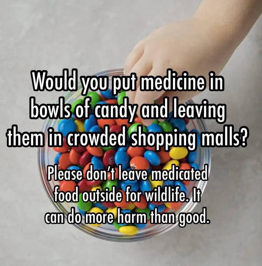 The same is true for wildlife. It’s dangerous to put medicated food outdoors and simply hope for the best. An animal that is sick enough to need treatment is sick enough that it needs to be captured and brought to a wildlife rehabilitator. There, it can deceive a correct diagnosis, an individualized treatment plan, and all the supportive care and monitoring it might need.