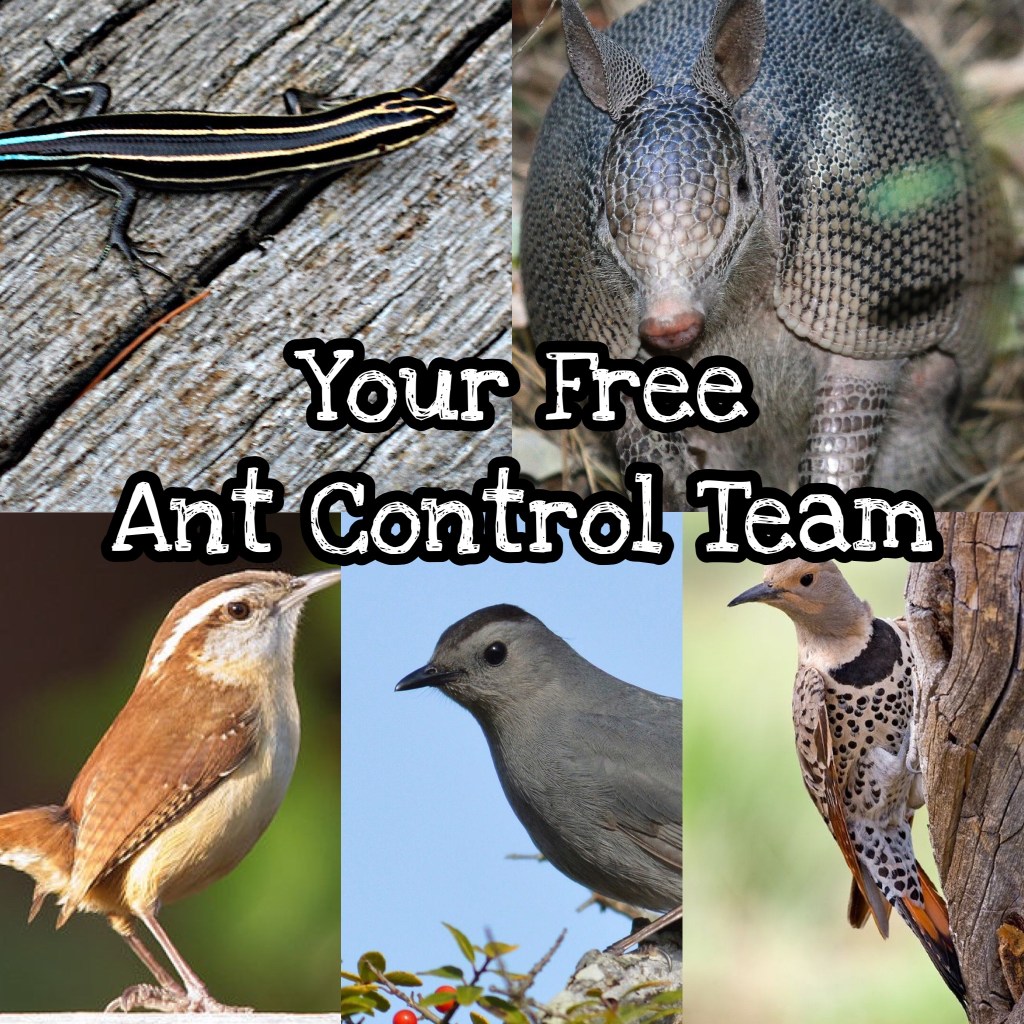 Out of all of our local wildlife, the two champion ant exterminator species are the Northern flicker and nine-banded armadillo. Northern flickers are among the few birds that will actually dig into the ground to eat ants, using its long barbed tongue to collect larvae and eggs in addition to adults. Armadillos, which are close relatives of anteaters, are also ant vacuums, slurping up thousands of them in one feeding and able to completely ignore their bites and stings.